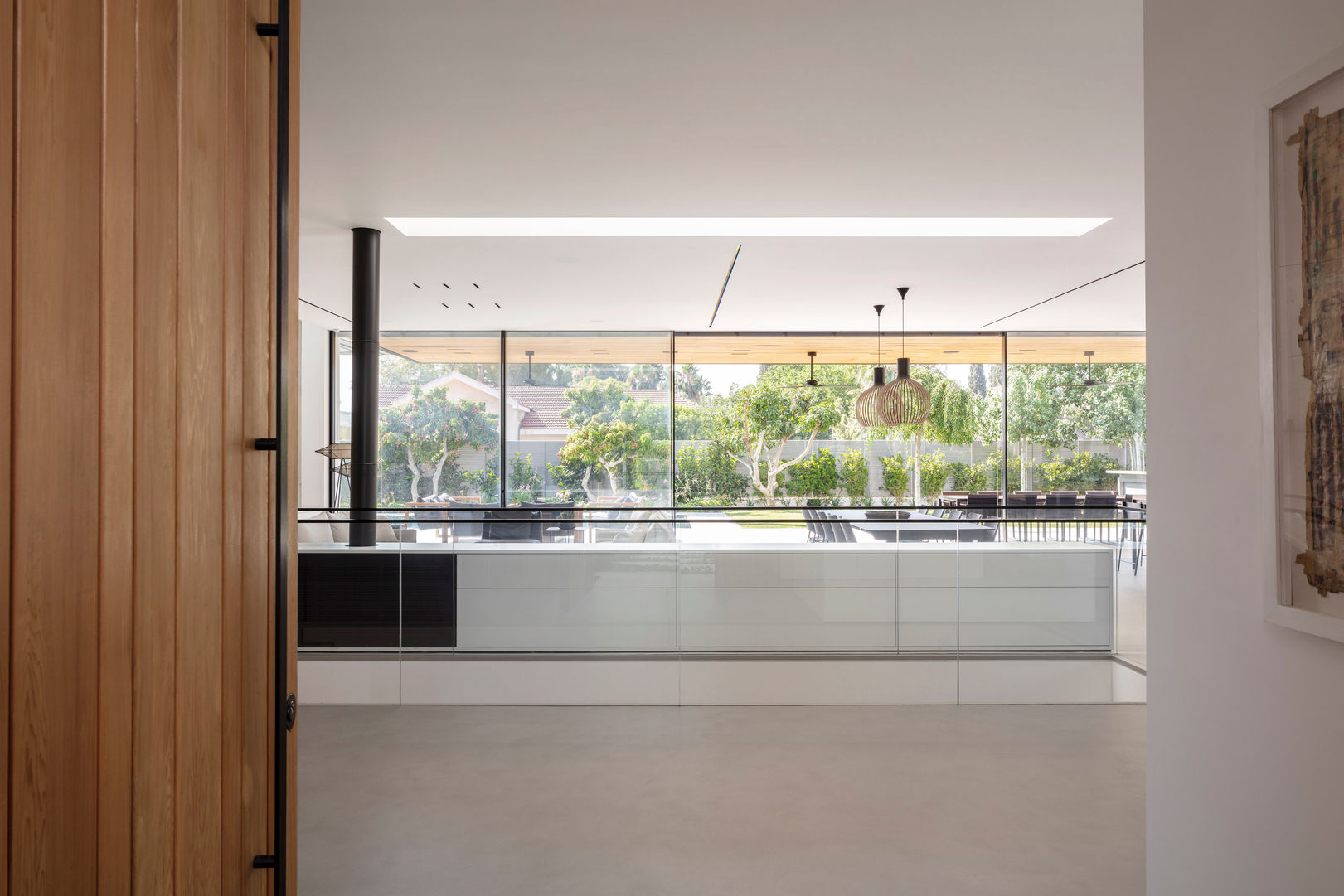 המפלס התחתון כולל חלל עבודה גדול וחלל חדר כושר ושניהם פונים לחצר תחתונה רחבת מימדים מוארת ובנויה מבטון חשוף.